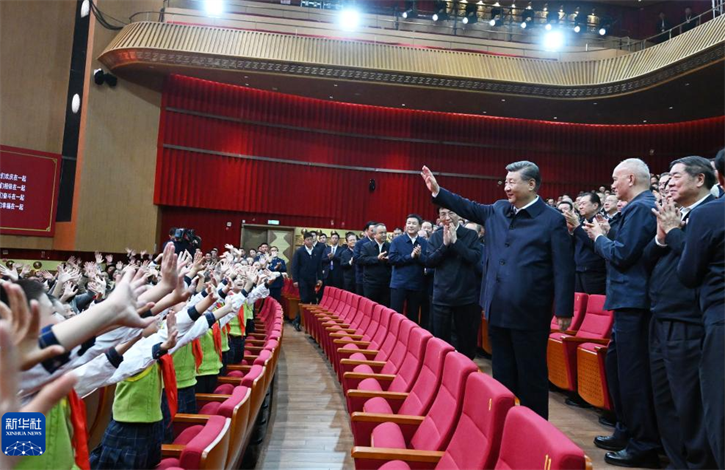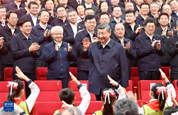 9月24日晚,庆祝新疆维吾尔自治区成立70周年文艺晚会《美丽新疆》在乌鲁木齐文化中心大剧院举行。中共中央总书记、国家主席、中央军委主席习近平观看演出。这是习近平向观看演出的新疆各族干部群众挥手致意。来源新华网/江澜分享